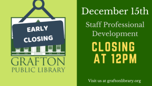 The Grafton Public Library will be closing at 12pm on Friday, December 15th for professional development. The Library will be open from 10:00am-12:00pm on Friday, and will reopen on Saturday, December 16th at 10:00am for normal operations.